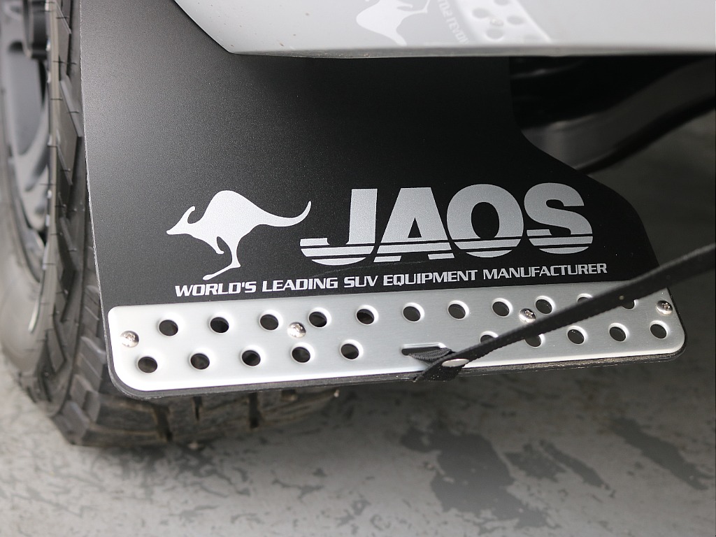 ジャオスのフロントバンパーガード・オーバーフェンダー・マッドフラップが 装着されておりオフロード感ある見た目になっています☆☆