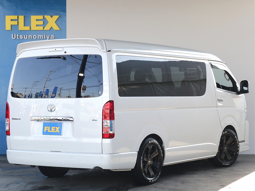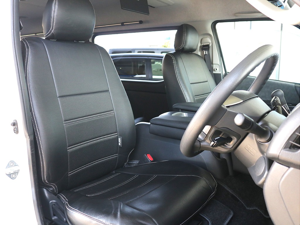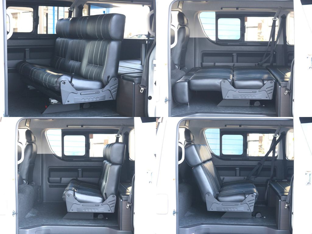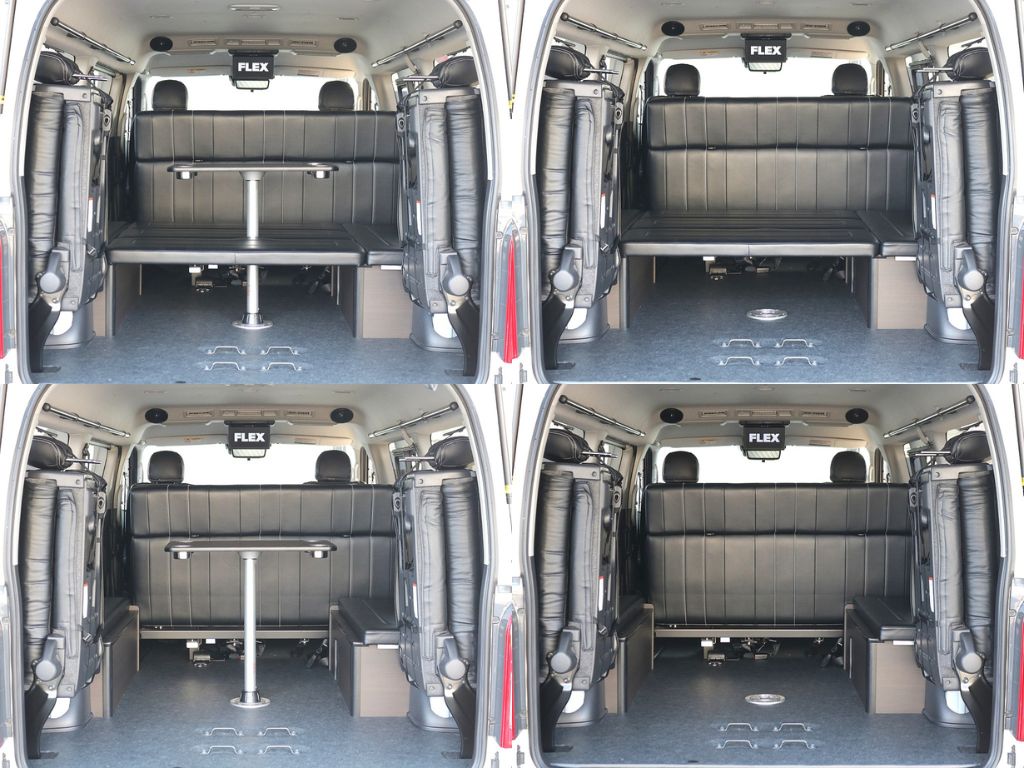 4列目は跳ね上げ可能! 荷物スペースや飲食スペースにも◎ 🛠️カスタム内容🛠️ ●ローダウン1.5インチ ●オリジナルフロントリップ ●オリジナルオーバーフェンダー ●オリジナルリアスポイラー ●内装架装アレンジAS ●専用フローリング施工 ●専用テーブル ●専用ベッドキット ●オリジナル17インチアルミホイール ●グッドイヤーナスカータイヤ ●オリジナルシートカバー
