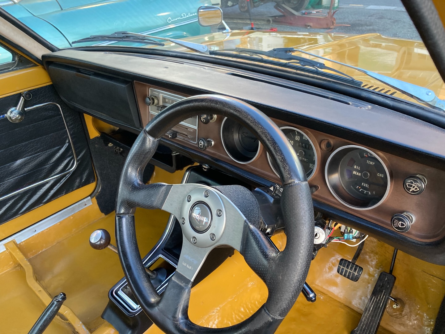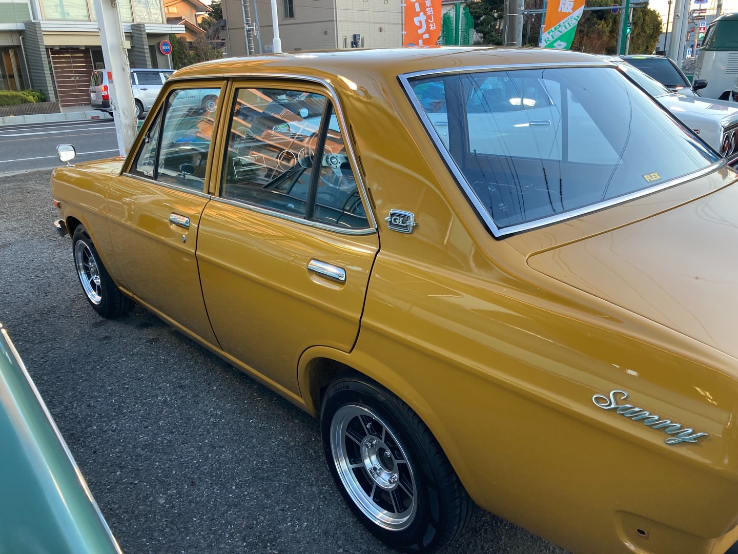 昭和45年 サニー4ドア1200GL 私も大好きなB110サニー クーペもセダンも出物は少ないです ブラウンに13インチのハヤシで良い雰囲気