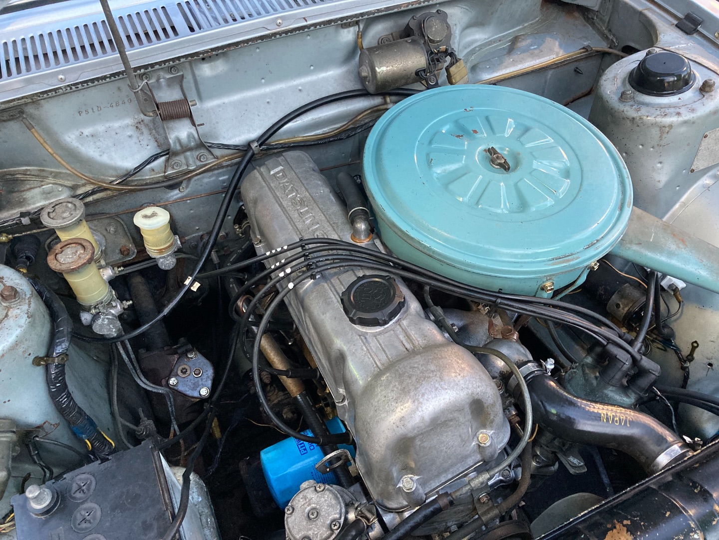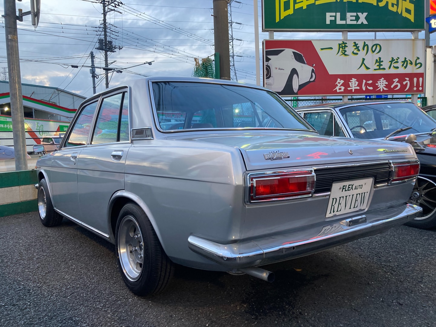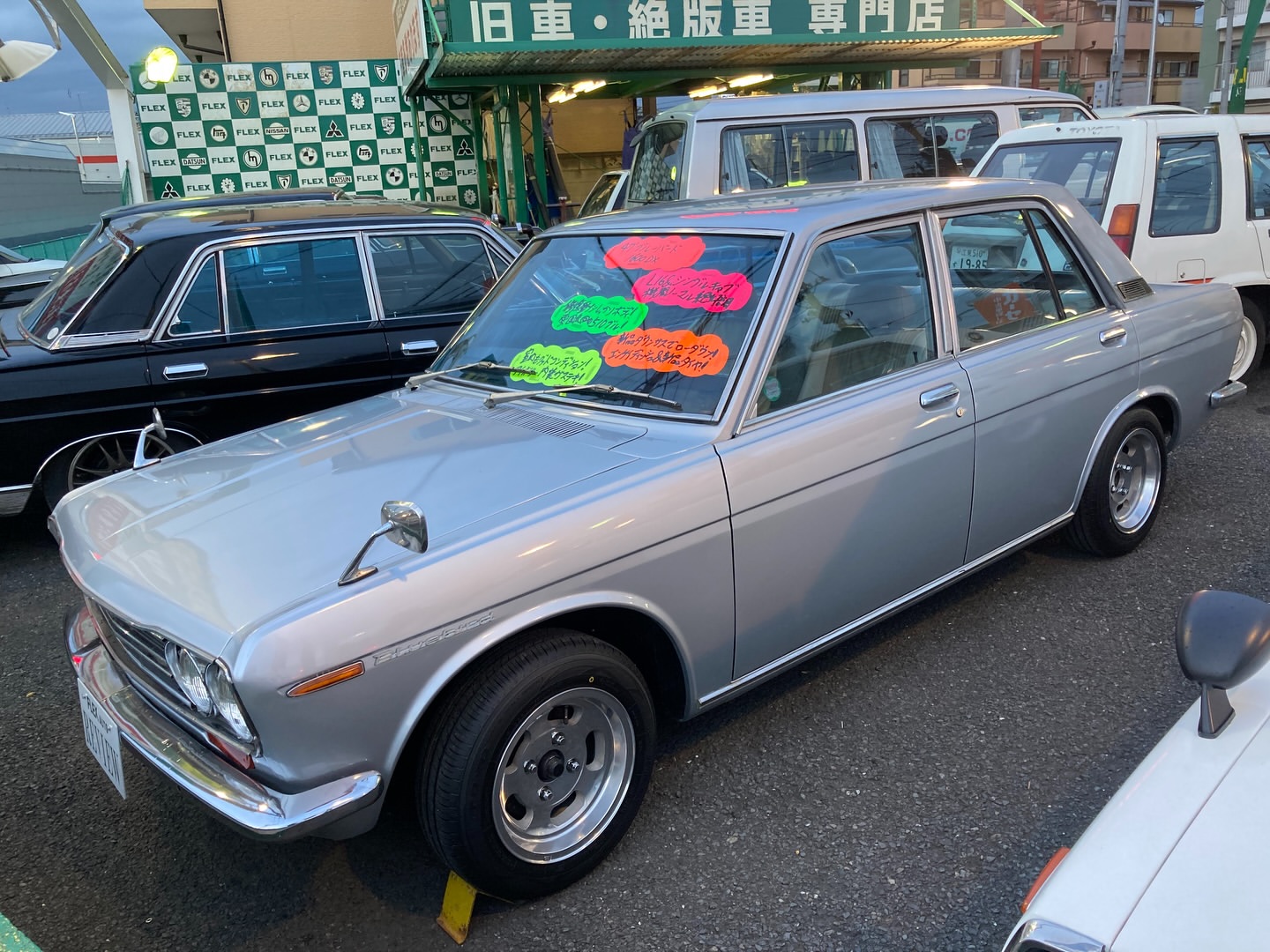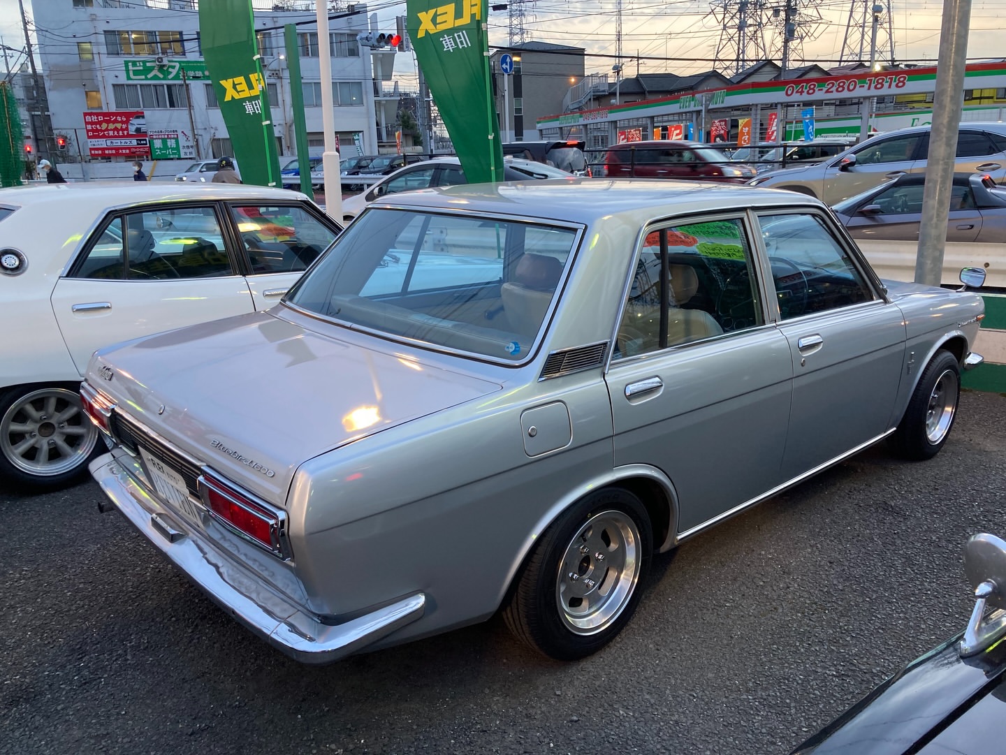 昭和47年 ブルーバード4ドア1600DX 最終型のP510が入庫 グリル&テールは中期の物に変更されてます エンケイディッシュが良いアクセントです!